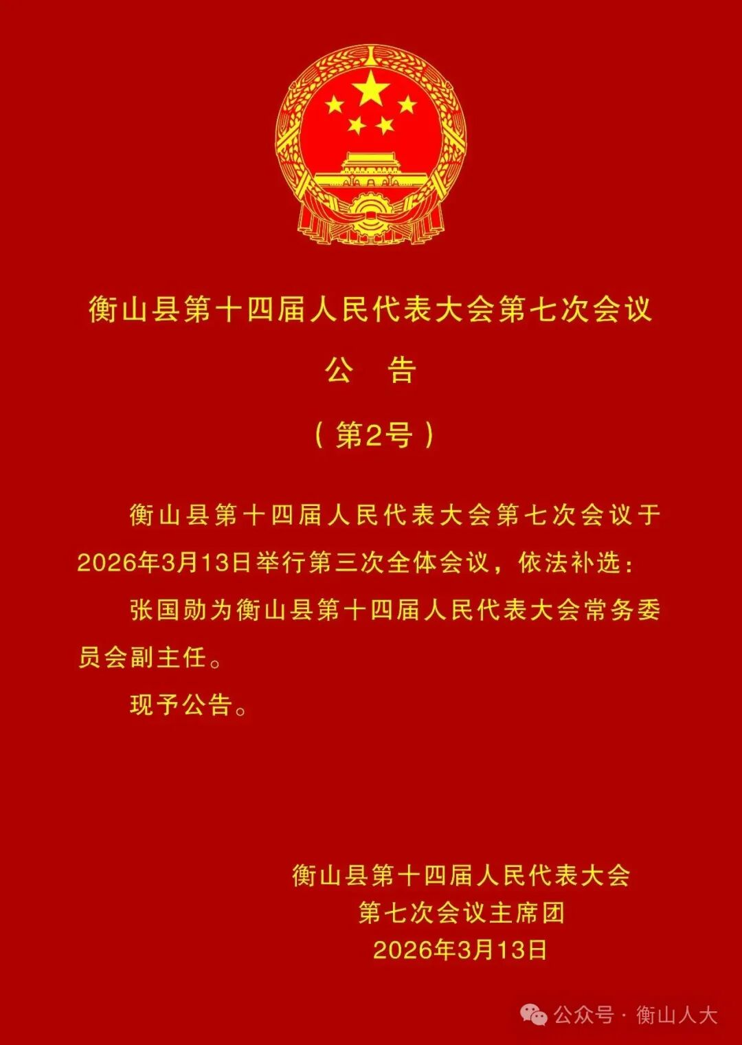 据衡山融媒消息,3月13日上午,衡山县第十四届人民代表大会第七次会议举行第三次全体会议,补选县人民政府县长、县人大常委会副主任。陈瑞来满票当选衡山县人民政府县长:张国勋满票当选衡山县人大常委会副主任。