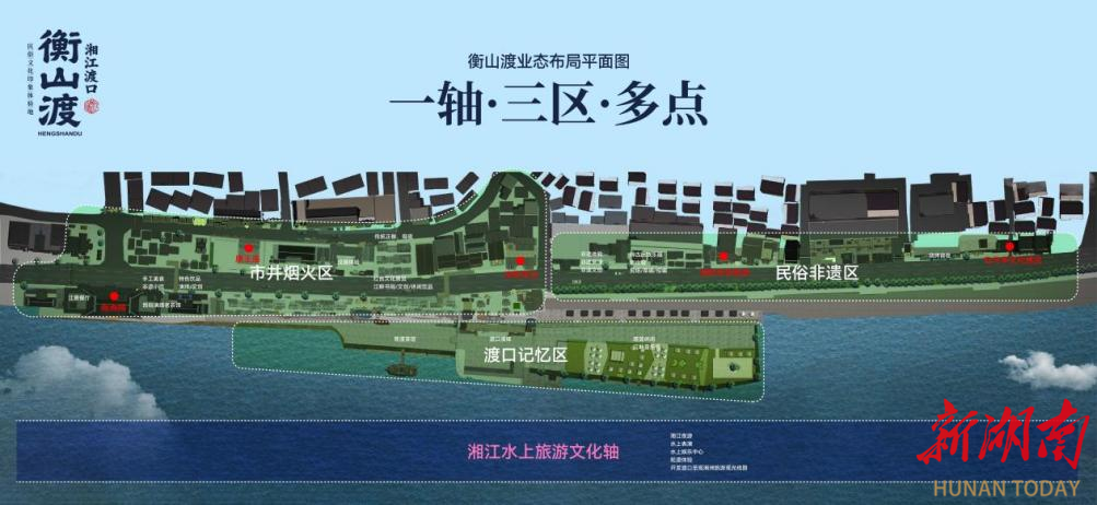 衡山渡以“文化为核、活态传承”为理念,规划“一轴·三区·多点”的空间格局,打造集渡口记忆、市井烟火与非遗体验于一体的湘江文旅新名片。